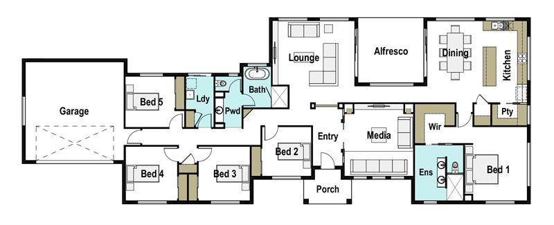 The Barrington 280 hip and valley design is an spacious rural style design option that is well suited to a large active family as with any Integrity design it is possible to customise a home to suit your personal taste, lifestyle and circumstances. This flexible approach is one of the reasons Integrity New Homes continues to be successful. Whether building on a flat block or a steep challenging site, the sales and design teams genuinely try to put forward design solutions which overcome problems, are functional and in tune with client requirements. The Barrington 280 delivers a five bedroom home with a open plan Kitchen, Living, Dining opening to the Alfresco which is covered by the main roof line and an additional living space.
